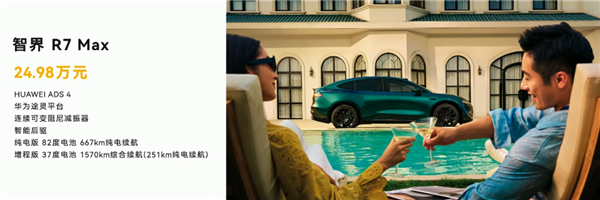 新车全系增程、纯电版本同价,各有两款版本。其中,新款智界R7入门Max版,纯电配备82kWh电池,续航为667km;增程版为37kWh电池包,纯电251km,综合续航1570km。