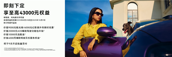 即刻下定享43000元的权益,包括价值9000元极光绿/6000元幻影紫外饰限时优惠、价值20000元ADS辅助驾驶功能包补贴、价值10000元选配金、价值4000元辅助驾驶无忧服务权益等,新车将于九月份开启批量交付。