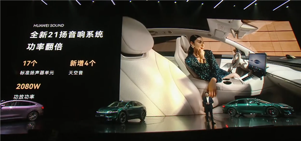 全车升级搭载21扬声器HUAWEI SOUND音响,中控台下方提供50瓦无线快充,通过HUAWEI MagLink可实现华为平板上车,多屏同享影音。车内也提供了8.2升双向开门冷暖箱。